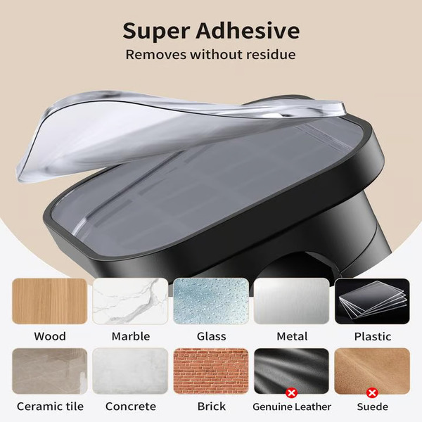 Mocno przylega do płaskich powierzchni, takich jak drewno, płytki, metal i gładkie ściany.