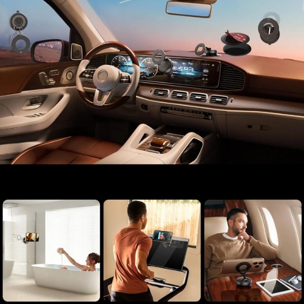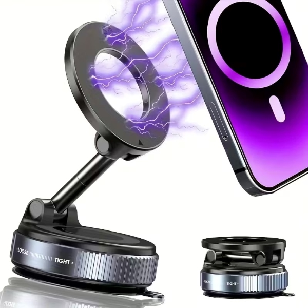 Uchwyt na telefon MAGHOLDZ wykorzystuje silny uchwyt próżniowy, który wzmacnia się przy wibracjach, pewnie utrzymując telefon na gładkich powierzchniach, nie pozostawiając śladów na szkle, desce rozdzielczej ani biurku.