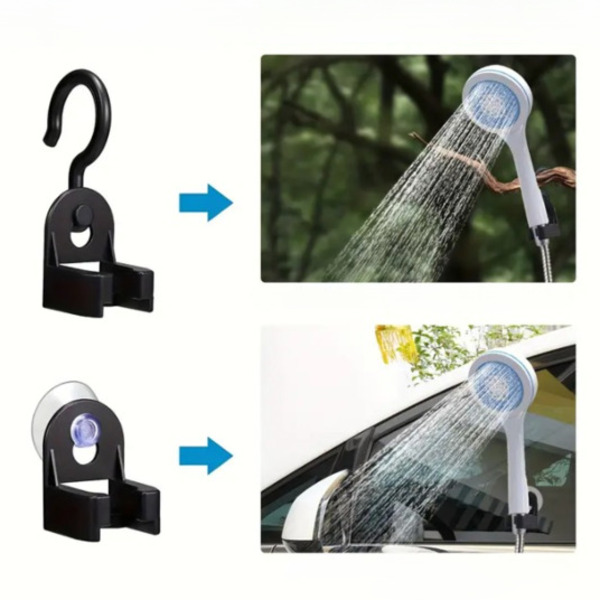 Przyssawka blokuje głowicę na każdej płaskiej powierzchni; haczyk podnosi ją wyżej, gdy potrzebujesz jej nad głową. Przy wadze 600 g i wężu 1,5 m zmieści się w każdej torbie, ładuje się w drodze i sprawdza się niezależnie od tego, czy spłukujesz błoto z butów, czy kąpiesz psa po długim spacerze.