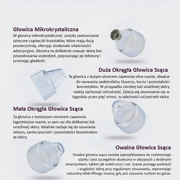 Urządzenie jest dostarczane z 4 wymiennymi nasadkami, z których każda została zaprojektowana z myślą o konkretnych potrzebach skóry. Zobacz poniższą grafikę, aby uzyskać więcej informacji na temat działania każdej nasadki!