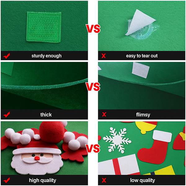 Wykonane są z tego samego grubego, wysokiej jakości filcu. Mocowane są za pomocą wszytych rzepów (w przeciwieństwie do tańszych, klejonych). Przykłady to dzwonki, prezenty, bałwan, cukierki i płatki śniegu. Choinka ma gwiazdę na górze i pień na dole. Rzepy są wszyte w choinkę, aby oba elementy były dobrze przymocowane.